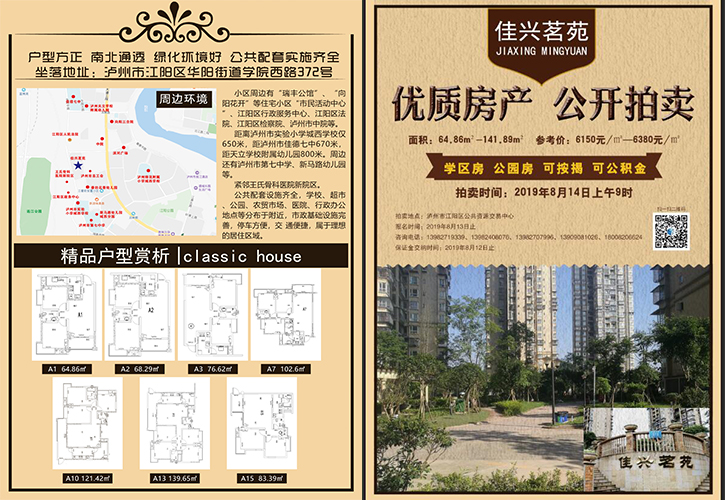 一、拍賣標的:坐落于瀘州市江陽區(qū)華陽街道學院西路372號“佳興茗苑”小區(qū)第一批次住房。(詳見房屋清單)